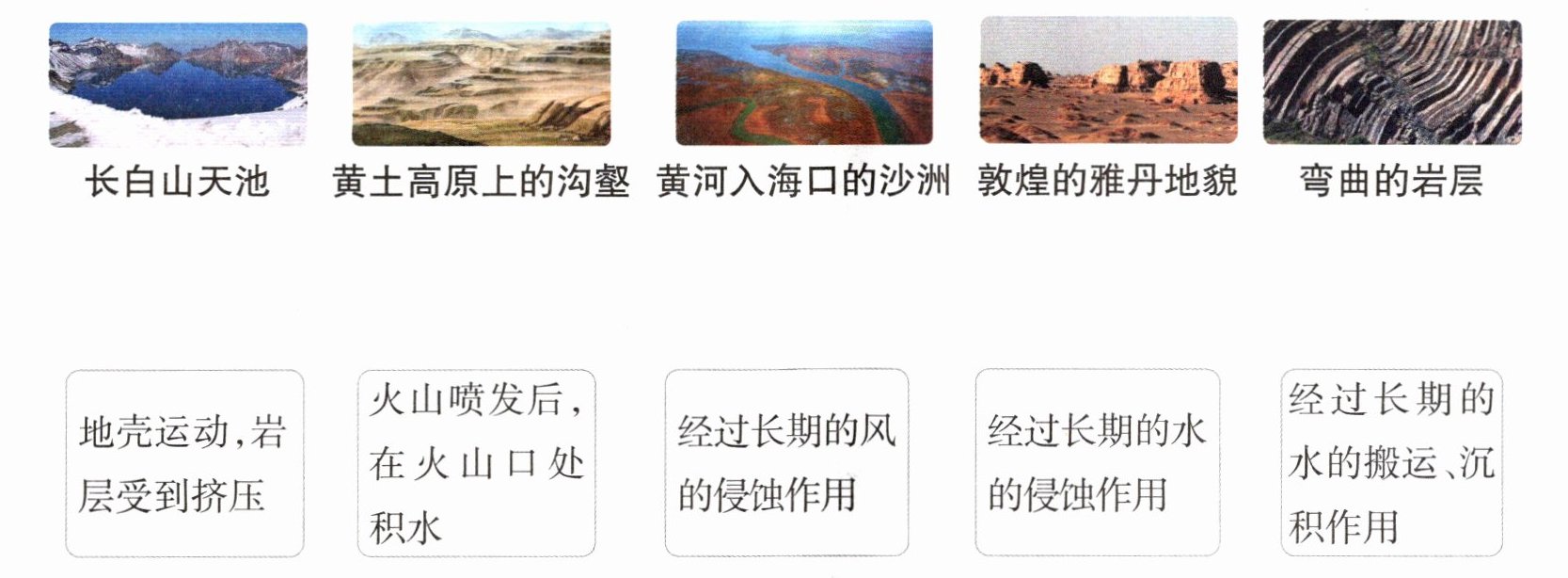 长白山天池—火山喷发后,在火山口处积水;黄土高原上的沟壑—经过长期的水的侵蚀作用;黄河入海口的沙洲—经过长期的水的搬运、沉积作用;敦煌的雅丹地貌—经过长期的风的侵蚀作用;弯曲的岩层—地壳运动,岩层受到挤压