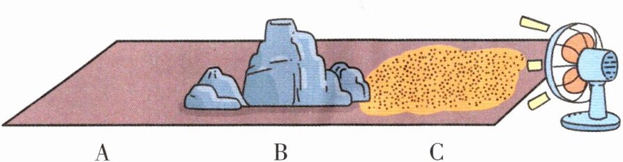 4. 小科进行“魔鬼城的形成”模拟实验。如下图所示,用泥土捏成了一块块岩石(B区),岩石右边铺上沙子和小石子(C区),沙子右边放了一个电风扇,调整角度把风吹往沙子和小石子。