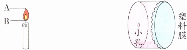 1. 用笔和直尺从蜡烛火焰的顶端A和底端B画直线(用箭头表示光的传播方向)至小孔,并延伸到塑料膜上。