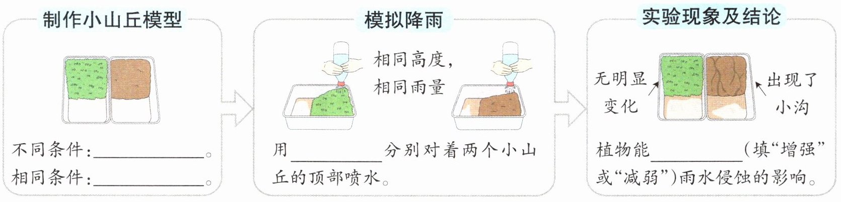 有无植物覆盖;小山丘的地形(坡度)等;喷壶;减弱