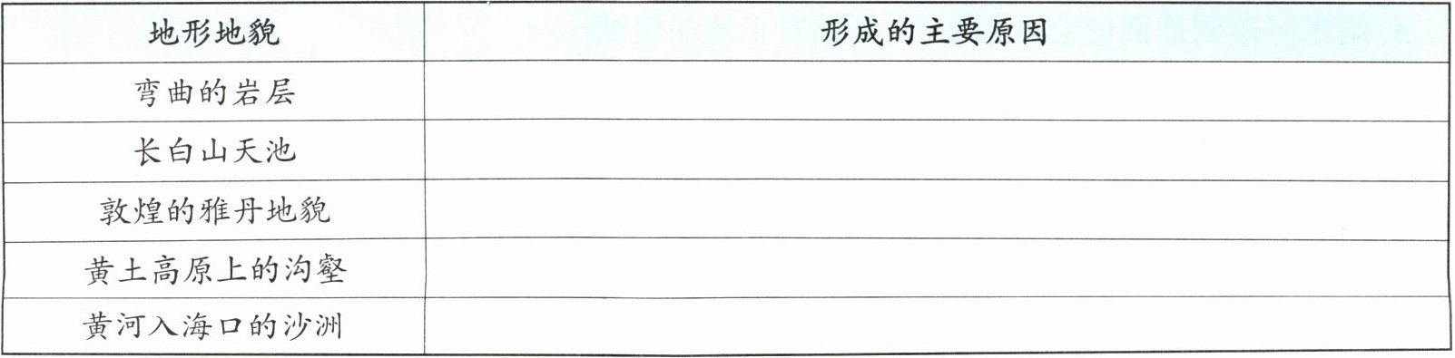 弯曲的岩层:地震(岩层受到挤压);长白山天池:火山喷发形成;敦煌的雅丹地貌:风的作用;黄土高原上的沟壑:水(降雨)的作用;黄河入海口的沙洲:水的作用(水流速度减慢,泥沙沉积)