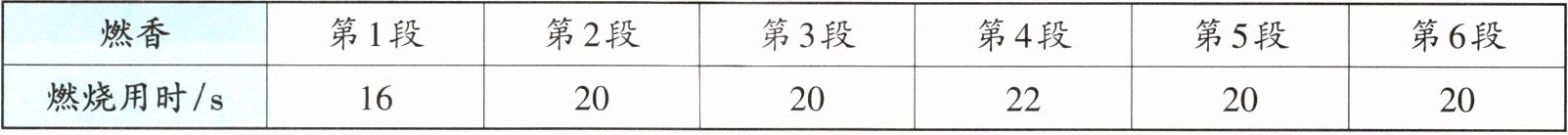 6. 小科将燃香均匀分成6段,每段燃烧所需时间如下表所示,下面说法最合理的是( )。