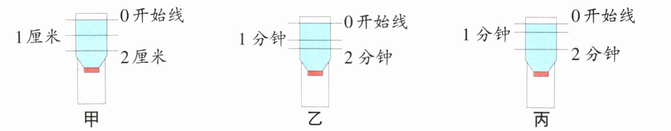 1. 如图甲,通过研究我们发现:水位从0开始线位置下降到1厘米位置比水位从1厘米位置下降到2厘米位置,所花的时间要______(填“长”或“短”)。