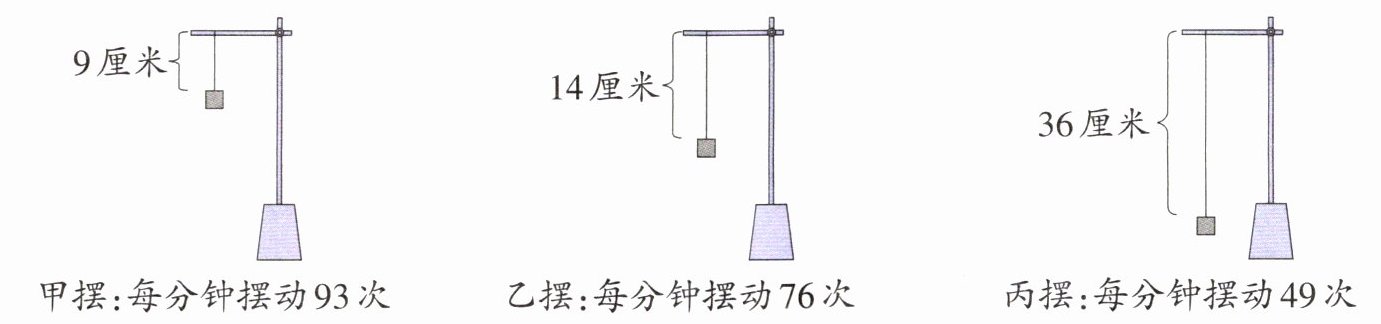 (1)摆绳越长摆动越慢,如果使用甲摆制作每分钟60次的摆,摆绳长度一定要比9厘米长,再结合乙摆和丙摆的摆动次数,可以确定摆长应该在14厘米到36厘米之间