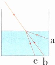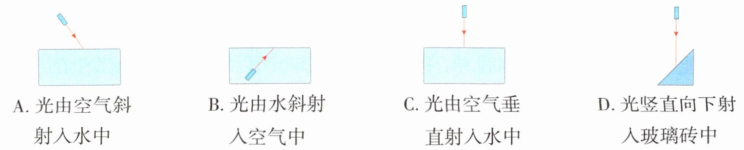 3. 如图所示,一束光斜射入水中,光在水中的传播路径最有可能是( )。