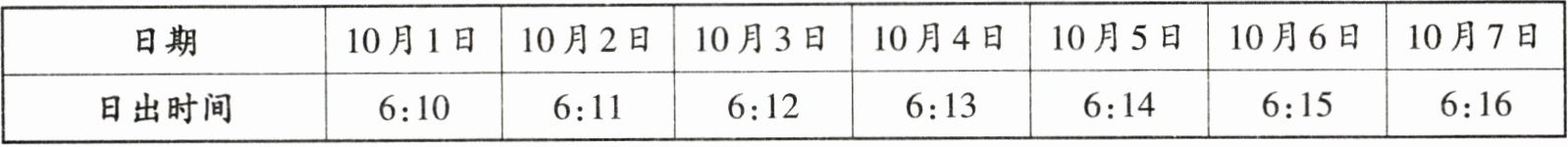 | 日出时间 | 6:10 | 6:11 | 6:12 | 6:13 | 6:14 | 6:15 | 6:16 |