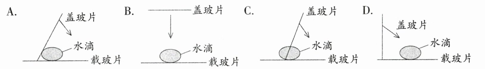 7. (名校期末真题)观察水中微小的生物需要制作装片,盖上盖玻片的操作要正确,不然会影响观察效果。下列方法正确的是( )。