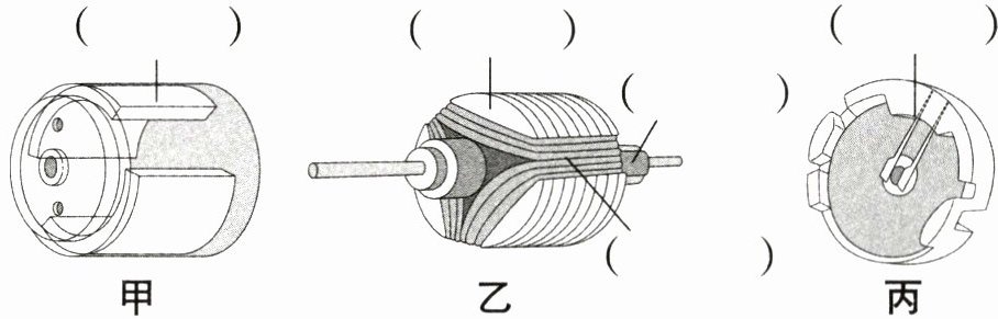 观察小电动机各部分的构造,其中乙图是______。在图中的括号内写出电动机各个部件的名称。