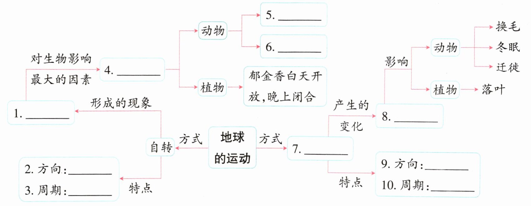 ①1年 ②1天 ③公转 ④光照 ⑤昼夜交替 ⑥四季变化 ⑦自西向东 ⑧自东向西 ⑨夜行性动物 ⑩昼行性动物
