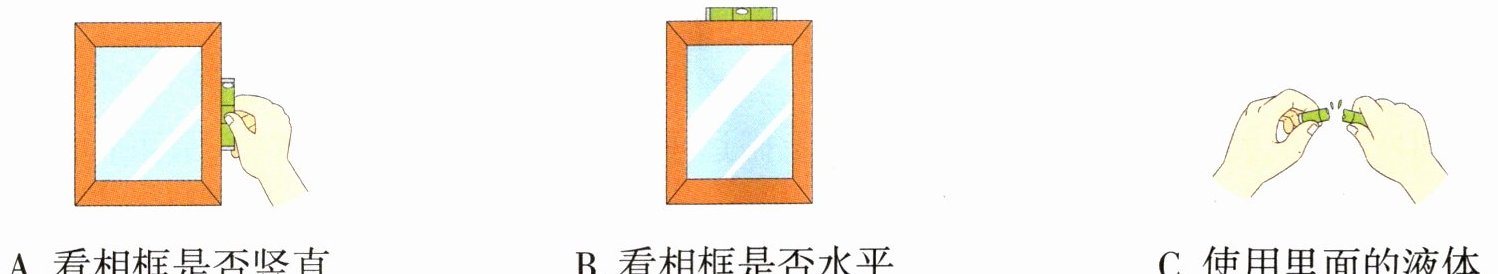 A. 看相框是否竖直 B. 看相框是否水平 C. 使用里面的液体
