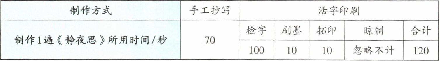 |制作1遍《静夜思》所用时间/秒|70|检字|刷墨|拓印|晾制|合计|