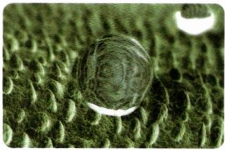 三、荷叶的启发。一次偶然的机会,小明发现雨后的荷叶表面居然没有沾水!风一吹,荷叶轻轻一抖就干了。在征得公园管理员同意后,小明获得了一株用于研究的活体荷叶样本,回家后便开始了观察。小明仔细触摸荷叶,发现荷叶表面并非光滑,而是十分粗糙,为什么粗糙的表面不滞留水和污垢呢?他上网查了资料,原来荷叶表面有很多小凸起,它们上面还长有绒毛,仿佛一只只触角保护着叶面,使得尺寸比它们缝隙大的东西(如水珠)根本无法靠近荷叶表面,从而实现了荷叶“出淤泥而不染”。