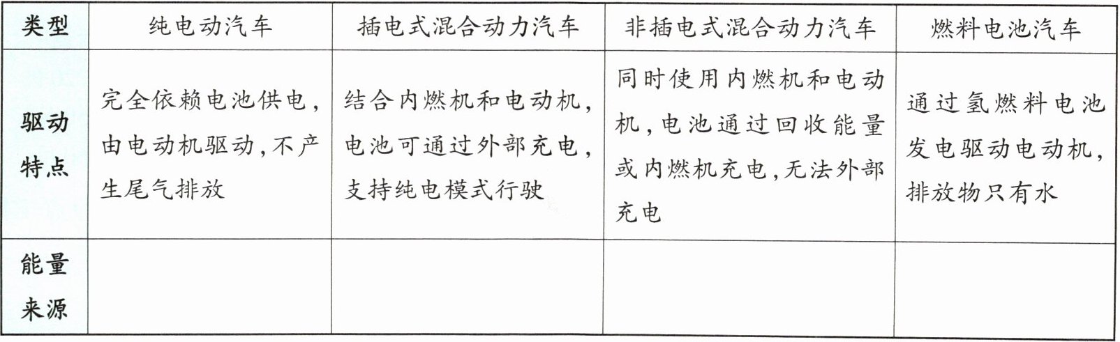 |驱动特点|完全依赖电池供电,由电动机驱动,不产生尾气排放|结合内燃机和电动机,电池可通过外部充电,支持纯电模式行驶|同时使用内燃机和电动机,电池通过回收能量或内燃机充电,无法外部充电|通过氢燃料电池发电驱动电动机,排放物只有水|