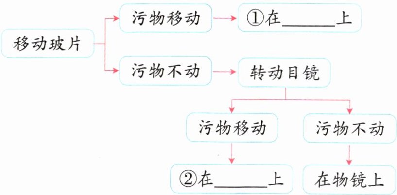 三、寻找污物。小科在使用显微镜时,经常发现视野中有小黑点这样的污物,严重影响观察效果。为了能正确快速判断污物可能存在的位置,画出了如下图的思维导图。请你在方框中填入合适的文字,将该思维导图补充完整。