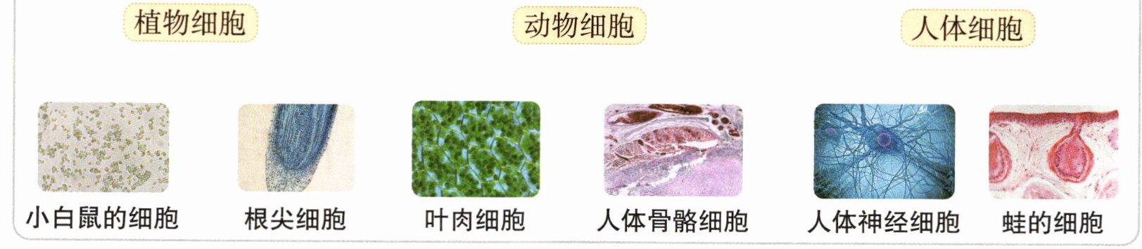 植物细胞——根尖细胞、叶肉细胞;动物细胞——小白鼠的细胞、蛙的细胞;人体细胞——人体骨骼细胞、人体神经细胞