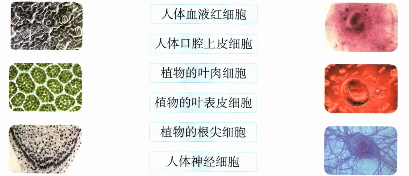 左一-植物的叶表皮细胞;左二-植物的叶肉细胞;左三-植物的根尖细胞;右一-人体口腔上皮细胞;右二-人体血液红细胞;右三-人体神经细胞