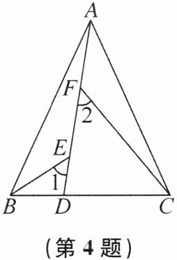 4. (2024连云港市海州区校级期中)如图,在△ABC中,AB= AC,AB>BC,点D在边BC上,CD= 2BD,点E,F在线段AD上,∠1= ∠2= ∠BAC.若△BDE的面积为2,△ABC的面积为21,则△CFD的面积为______.