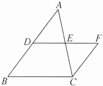 (1),得△AED ≌ △CEF,所以AD = CF,DE = FE,即DE = $\frac{1}{2}$DF.因为D是AB的中点,所以AD = BD,所以BD = CF.因为CF//AB,所以∠BDC = ∠FCD.在△BDC和△FCD中,$\left\{\begin{array}{l} BD = FC,\\ ∠BDC = ∠FCD,\\ CD = DC,\end{array}\right. $所以△BDC ≌ △FCD(SAS),所以BC = DF,∠BCD = ∠FDC,所以DE//BC,DE = $\frac{1}{2}$BC.
