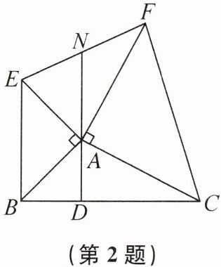 2. 如图,在$\triangle ABC$中,以$AB$,$AC为腰作等腰直角三角形ABE和等腰直角三角形ACF$,连接$EF$,$AD为边BC$上的高线,延长$DA交EF于点N$.给出下列结论:①$\angle EAN= \angle ABC$;②$\triangle EAN\cong\triangle BAD$;③$S_{\triangle AEF}= S_{\triangle ABC}$;④$EN= FN$.其中正确的有______