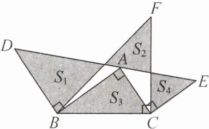 例4 (常州市期末)如图,在Rt△ABC中,∠BAC= 90°,分别以△ABC的三条边为直角边作三个等腰直角三角形△ABD,△ACE,△BCF.若图中阴影部分的面积$S_1= 6.5,S_2= 3.5,S_3= 5.5,$则S_4= ______.