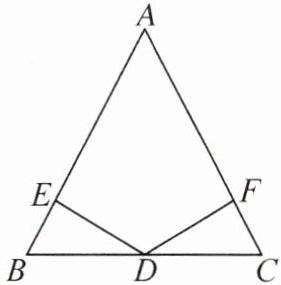 证明:因为D是BC的中点,所以BD=CD.因为DE⊥AB,DF⊥AC,所以∠BED=∠DFC=90°,所以∠B=90°-∠BDE=60°.在Rt△BED和Rt△CFD中,$\left\{\begin{array}{l} BD=CD,\\ BE=CF,\end{array}\right.$所以Rt△BED≌Rt△CFD(HL),所以∠C=∠B=60°,所以△ABC是等边三角形.