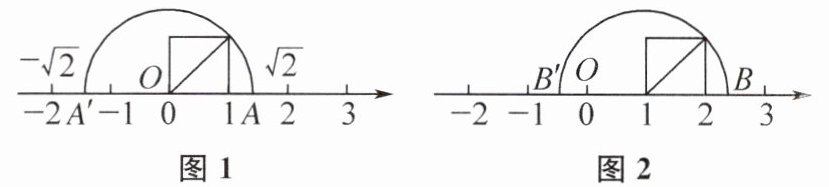 |拓展思考:如图2,改变图1中正方形的位置,用类似的方法作图,可在数轴上构造出线段OB与OB',其中O仍为原点,点B,B'分别在原点的右侧、左侧,可由线段OB与OB'的长得得到点B,B'所表示的无理数.按照这样的思路,只要构造出特定长度的线段,就能在数轴上找到无理数对应的点.|