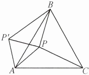 (1)由旋转的性质,得$AP' = AP = 6$,$\angle P'AB = \angle PAC$,所以$\triangle P'AP$是等腰三角形。因为$\triangle ABC$是等边三角形,所以$\angle BAC = 60^{\circ}$,所以$\angle PAC + \angle BAP = 60^{\circ}$。所以$\angle P'AP = \angle P'AB + \angle BAP = 60^{\circ}$。所以$\triangle P'AP$是等边三角形,所以$PP' = 6$。