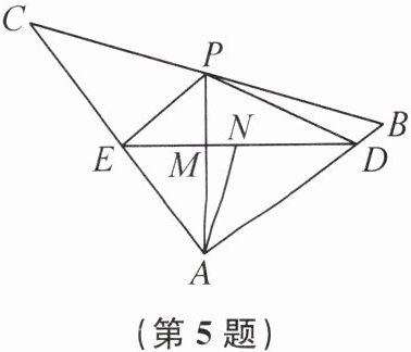 5. 如图,在$\triangle ABC中AB= 6$,$AC= 8$,$BC= 10$,$P为边BC$上一动点,连接$AP$,$DE\perp AP$,分别交$AB$,$AC于点D$,$E$,垂足为$M$,$N为DE$的中点.若四边形$ADPE$的面积为 18,则$AN$的最大值为______