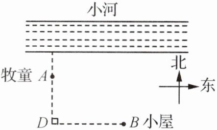 5. 如图,一个牧童在小河南面4 km的点A处牧马,此时他正位于他的小屋B的西面8 km、北面7 km处,他想把他的马牵到小河边去饮水,然后回到小屋,则他要走的最短路程是多少?