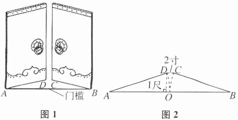 2. 《九章算术》是古代东方数学代表作,书中记载:"今有开门去阃(读kǔn,门槛的意思)一尺,不合二寸,问门广几何?"题目大意是:如图1、图2(图2为图1的平面示意图),推开双门,双门间隙CD的距离为2寸,C,D两点到门槛AB的距离都为1尺(1尺= 10寸),则AB的长是(