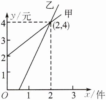 1. 如图是甲、乙两家商店销售同一种产品的销售价 y(元)与销售量 x(件)之间的函数图象.有下列说法:①买2件时甲、乙两家售价一样;②买1件时买乙家的合算;③买3件时买甲家的合算;④买1件乙家的售价约为3元.其中正确的说法是 (