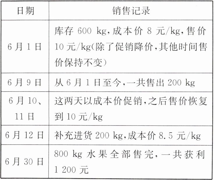 |6月30日|800 kg水果全部售完,一共获利1200元|