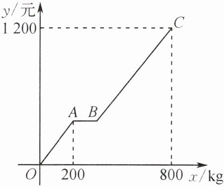 (2)设点 B 的坐标为$(a,400)$.根据题意,得$(10-8)×(600-a)+(10-8.5)×200=1200-400$,解得$a=350$.所以点 B的坐标为$(350,400)$.设线段 BC 所在直线的函数表达式为$y=kx+b(k≠0)$.因为B,C 两点的坐标分别为$(350,400),(800,1200)$,所以$\left\{\begin{array}{l} 350k+b=400,\\ 800k+b=1200,\end{array}\right. $解得$\left\{\begin{array}{l} k=\frac {16}{9},\\ b=-\frac {2000}{9}.\end{array}\right. $所以线段 BC 所在直线的函数表达式为$y=\frac {16}{9}x-\frac {2000}{9}.$