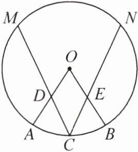 8. (2024 南京市鼓楼区期中)如图,OA,OB 是⊙O 的半径,且$\widehat {AC}= \widehat {BC}$,弦 CM,CN 分别经过 OA,OB 的中点 D,E.