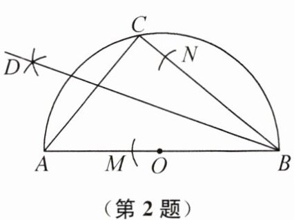 2. (2024 湖北省中考)如图,AB 是半圆 O 的直径,C 为半圆 O 上一点,以点 B 为圆心,适当长为半径画弧,交 BA 于点 M,交 BC 于点 N,分别以点 M,N 为圆心,大于$\frac{1}{2}MN$的长为半径画弧,两弧在$\angle ABC$的内部相交于点 D,画射线 BD,连接 AC.若$\angle CAB= 50^{\circ}$,则$\angle CBD$的度数是(
