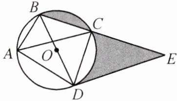 (1)可知,∠DCE=90°,C 是半圆的中点,所以由圆的对称性可知,$S_{阴影}=S_{\triangle DCE}=\frac{1}{2}CD\cdot CE=\frac{1}{2}×2\sqrt{2}×3\sqrt{2}=6$.