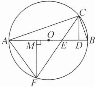 (1)知,∠BEC=∠BCE,所以 BE=BC. 因为 AF=EF,FM⊥AB,所以 MA=ME=2,AE=4,所以圆的半径 OA=OB=AE - OE=3,所以 BC=BE=OB - OE=2. 在△ABC 中,AB=6,BC=2,∠ACB=90°,所以 AC=$\sqrt{AB^{2}-BC^{2}}=\sqrt{6^{2}-2^{2}}=4\sqrt{2}$.