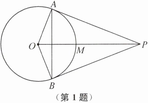 1. (2024 南京市联合体期中)如图,已知 PA,PB 是$\odot O$的两条切线,A,B 为切点,线段 OP 交$\odot O$于点 M. 给出下列四种说法:①$PA= PB$;②$OP⊥AB$;③四边形 OAPB 有外接圆;④点 M 是$\triangle ABP$的内心. 其中所有正确说法的个数是 (