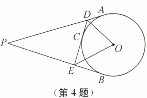4. (2024 徐州市期中)如图,P 是$\odot O$外的一点,PA,PB 分别与$\odot O$相切于点 A,B,C 是劣弧 AB 上的任意一点,过点 C 的切线分别交 PA,PB 于点 D,E. 若$PA= 4$,则$\triangle PED$的周长为
