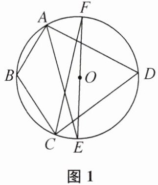 证法2:如图1,连接AF.因为四边形ABCD内接于$\odot O$,所以∠BAD+∠BCD=180°.因为AE平分∠BAD,CF平分∠BCD,所以$∠1=\frac{1}{2}∠BAD$,$∠2=\frac{1}{2}∠BCD$,所以∠1+∠2=90°.由同弧所对的圆周角相等可得∠2=∠3,所以∠1+∠3=90°,即∠EAF=90°.所以EF是$\odot O$的直径.