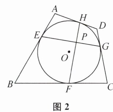 (2)如图 2,已知四边形 ABCD 既有外接圆,又有内切圆,它的内切圆$\odot O$与 AB,BC,CD,AD 分别相切于点 E,F,G,H. 连接 EG,FH 交于点 P. 求证:$EG⊥FH.$