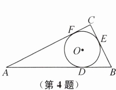 4. (2024 盐城市大丰区期中)如图,在$Rt\triangle ABC$中,$∠C= 90^{\circ },\triangle ABC的内切圆\odot O$与 AB,BC,CA 分别相切于点 D,E,F,若$\odot O$的半径为 2,$AD\cdot DB= 24$,则 AB 的长为