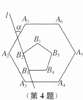 4. 如图,正六边形$A_1A_2A_3A_4A_5A_6$内部有一个正五边形$B_1B_2B_3B_4B_5$,且$A_3A_4// B_3B_4$,直线$l经过点B_2,B_3$,则直线$l与A_1A_2的夹角\alpha$的度数为______