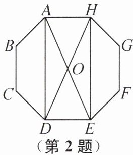 2. (2024 南京市秦淮区期中)如图,在正八边形 ABCDEFGH 中,连接 AD,EH,AE,DH,AE 与 DH 交于点 O. 给出下列结论:①$BC^2+EH^2= AE^2$;②$\frac{AD}{AH}= 2+\sqrt{2}$;③$\angle AOD= 135^{\circ}$;④$S_{\text{八边形}ABCDEFGH}= 4S_{\text{四边形}ABCD}$. 其中正确的是 (