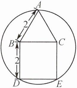 过点A作AG⊥DE于点G,交BC于点H,易知圆心在AG上,记为O,连接OD.因为四边形BDEC是正方形,所以BC//DE.因为AG⊥DE,所以AG⊥BC.又因为△ABC为等边三角形,所以BH=CH,∠BAH=∠CAH=30°,所以$BH=CH=\frac{1}{2}AB=1$.由勾股定理,得$AH=\sqrt{AB^2-BH^2}=\sqrt{3}$.设OA=x,则OD=x,$OG=\sqrt{3}+2-x$.在Rt△ODG中,由勾股定理,得$OD^2=OG^2+GD^2$,即$x^2=(\sqrt{3}+2-x)^2+1^2$,解得x=2.所以该圆的半径为2.