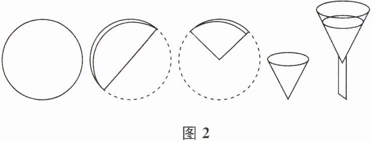 (1) 滤纸能紧贴此漏斗内壁,理由如下:设圆锥底面圆半径为r,母线长为R. 由2πr=$\frac{nπR}{180}$,得$\frac{n}{360}$=$\frac{r}{R}$. 图1中,滤纸围成的圆锥圆心角$n_1$=90°×2=180°;图2中,当滤纸能紧贴时,$\frac{r}{R}$=$\frac{3.5}{7}$=$\frac{1}{2}$,所以$n_2$=180°. 因为$n_1$=$n_2$,所以滤纸能紧贴此漏斗内壁.