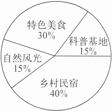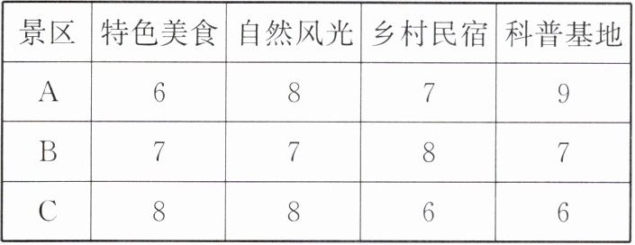 (3)将特色美食、自然风光、乡村民宿和科普基地四项得分的百分比定为20%,30%,30%,20%.景区A得分为(6×20%+8×30%+7×30%+9×20%)÷100%=7.5,景区B得分为(7×20%+7×30%+8×30%+7×20%)÷100%=7.3,景区C得分为(8×20%+8×30%+6×30%+6×20%)÷100%=7.因为7.5>7.3>7,所以选择A景区去游玩.(答案不唯一)