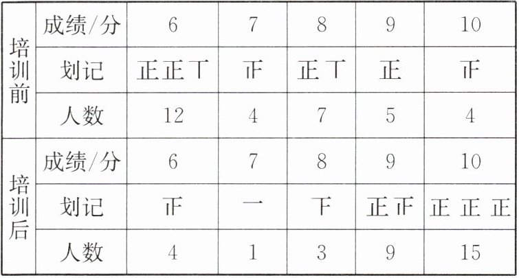 6. 某校九年级 640 名学生在“信息素养提升”培训前、后各参加了一次水平相同的测试,并以同一标准折算成“6 分”“7 分”“8 分”“9 分”“10 分”5 个成绩. 为了了解培训效果,用抽样调查的方式从中抽取了 32 名学生的两次测试成绩,并用划记法制成了如下表格: