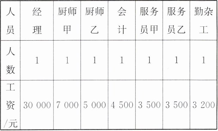 (1)餐厅所有员工的平均工资为$(30\ 000+7\ 000+5\ 000+4\ 500+3\ 500+3\ 500+3\ 200)÷7=8\ 100(\text{元})$.