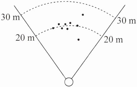 5. (2024常州市中考)小丽进行投掷标枪训练,总共投掷10次,前9次标枪的落点如图所示,记录成绩(单位:m),此时这组成绩的平均数是20 m,方差是$s^{2}_{1}m^{2}$. 若第10次投掷标枪的落点恰好在20 m线上,且投掷结束后这组成绩的方差是$s^{2}_{2}m^{2}$,则$s^{2}_{1}$